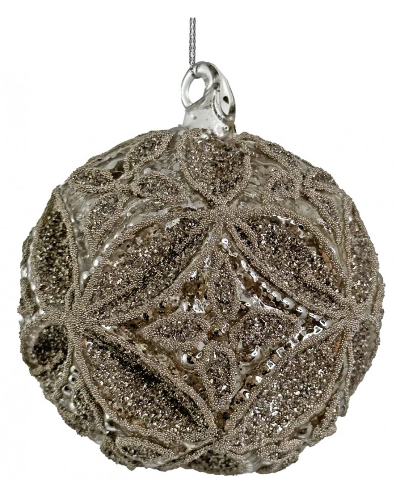 Skleněná vánoční ozdoba ve stříbrném odstínu s dekorem připomínající květy. Elegantní design dodává ozdobě slavnostní lesk a působí nadčasově. Ideální pro vánoční stromek i do dekorativních aranžmá.
